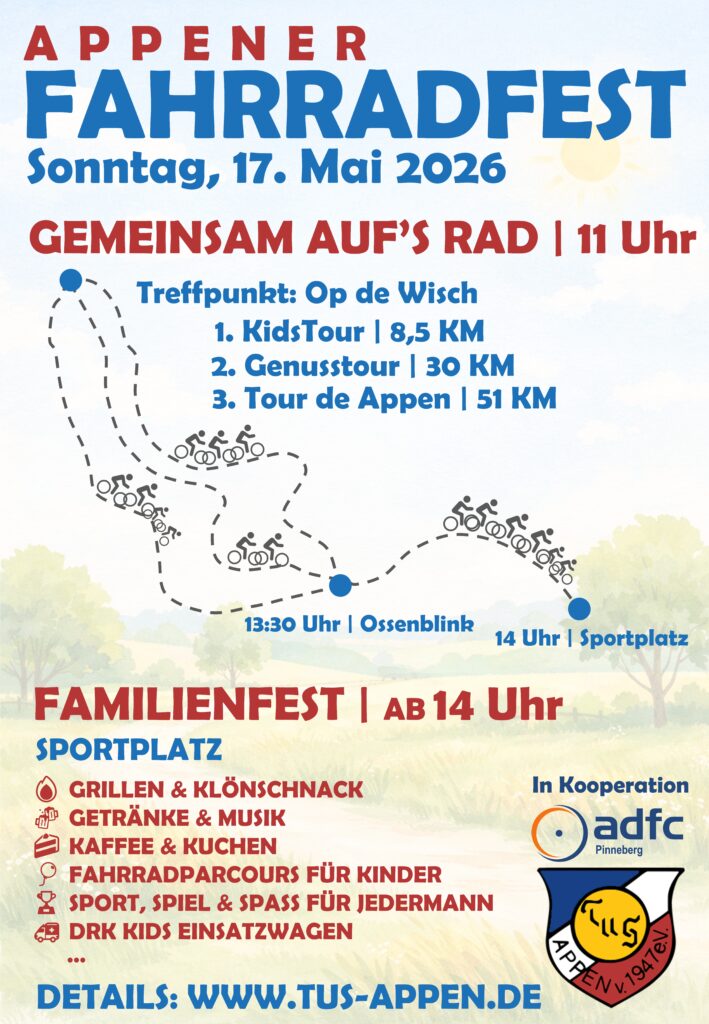 Im Appener Stadtradeln-Zeitraum veranstaltet der TuS Appen in Kooperation mit dem ADFC Pinneberg diesen besonderen Tag für Jung und Alt: voller Bewegung, Begegnung und einem bunten Familienfest mit Sport, Spiel und ganz viel Spaß.Wer möchte, nimmt an einer der generationenübergreifenden Fahrradtouren teil – hier ist für jede und jeden etwas dabei. Die Touren werden von erfahrenen Fahrrad-Guides begleitet.