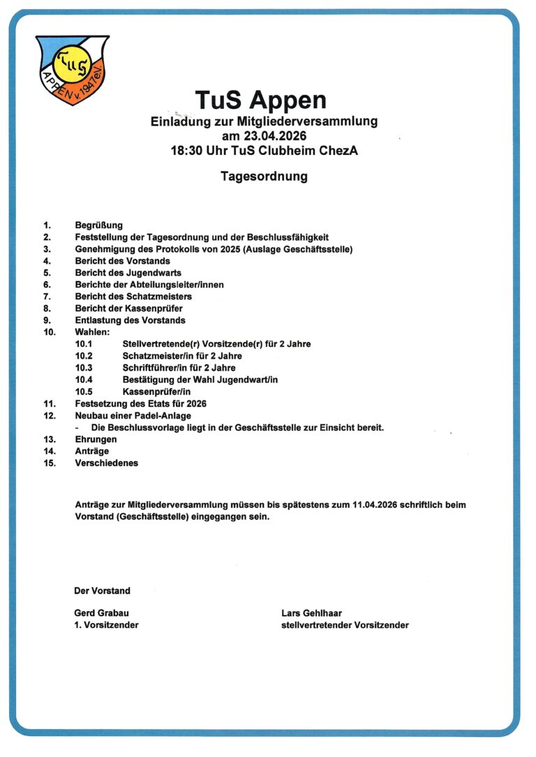 Mitgliederversammlung am 23.04.2026 30. März 2026 von Anja Martens Der Vorstand TuS Appen lädt zur diesjährigen Mitgliedersammlung ein. Über das zahlreiche Erscheinen unserer Mitglieder würden wir uns sehr freuen. Die vorläufige Tagesordnung und alle weiteren Informationen zur ordentlichen MV nachfolgend: